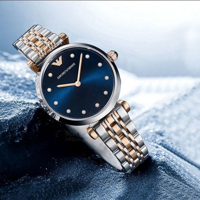 Add a touch of modern elegance to your collection with the Emporio Armani AR11092 Gianni T-Bar Womens Watch. This sophisticated timepiece features a stainless steel two-tone bracelet in silver and rose gold, perfectly complementing the deep blue dial. The silver-tone case enhances the refined look, while the signature Emporio Armani logo marks its prestige. Whether you’re dressing for work or a special event, this watch brings timeless style to every moment.