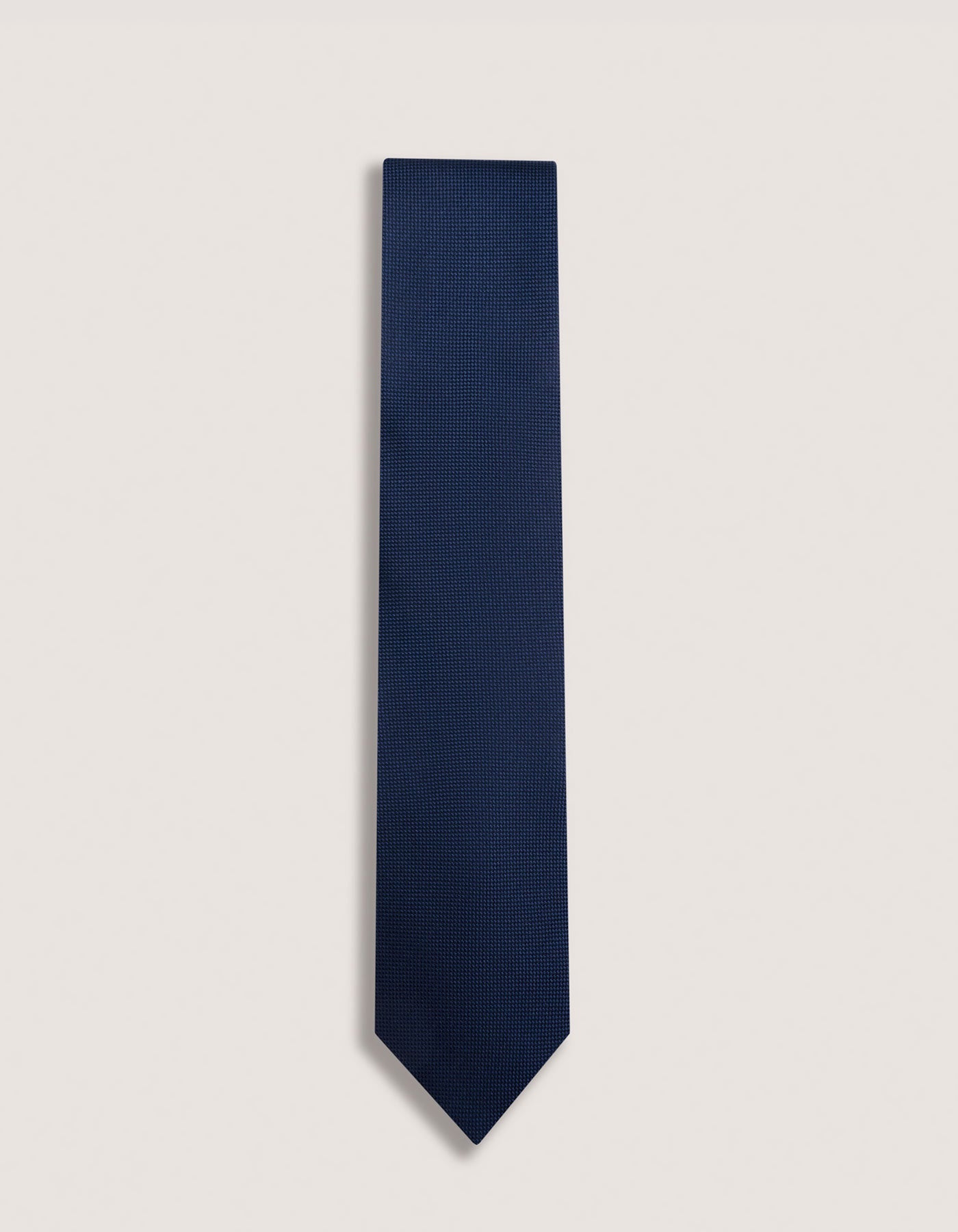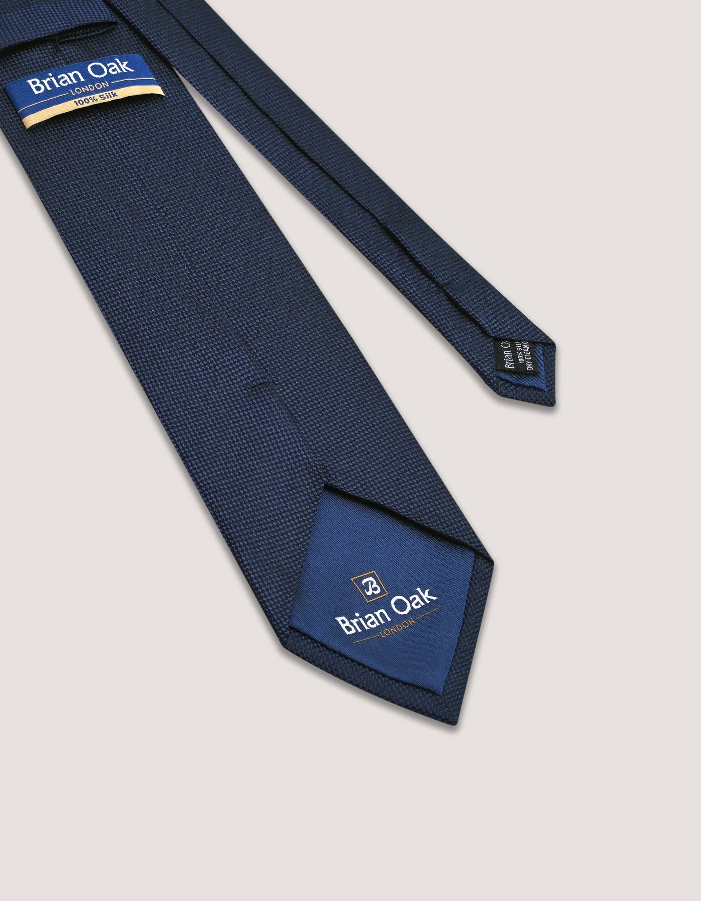 The colour of this silk self printed tie is a perfect navy blue, making it incredibly versatile. It pairs well with a wide range of coloured formal shirts including white, black, light blue, and even lighter shades of grey. You can also wear it with a variety of chino colours, from black to navy blue, or even a brown chino (as long as the colours don't clash). The high-quality silk fabric makes it a great choice for business meetings, interviews, or formal events.