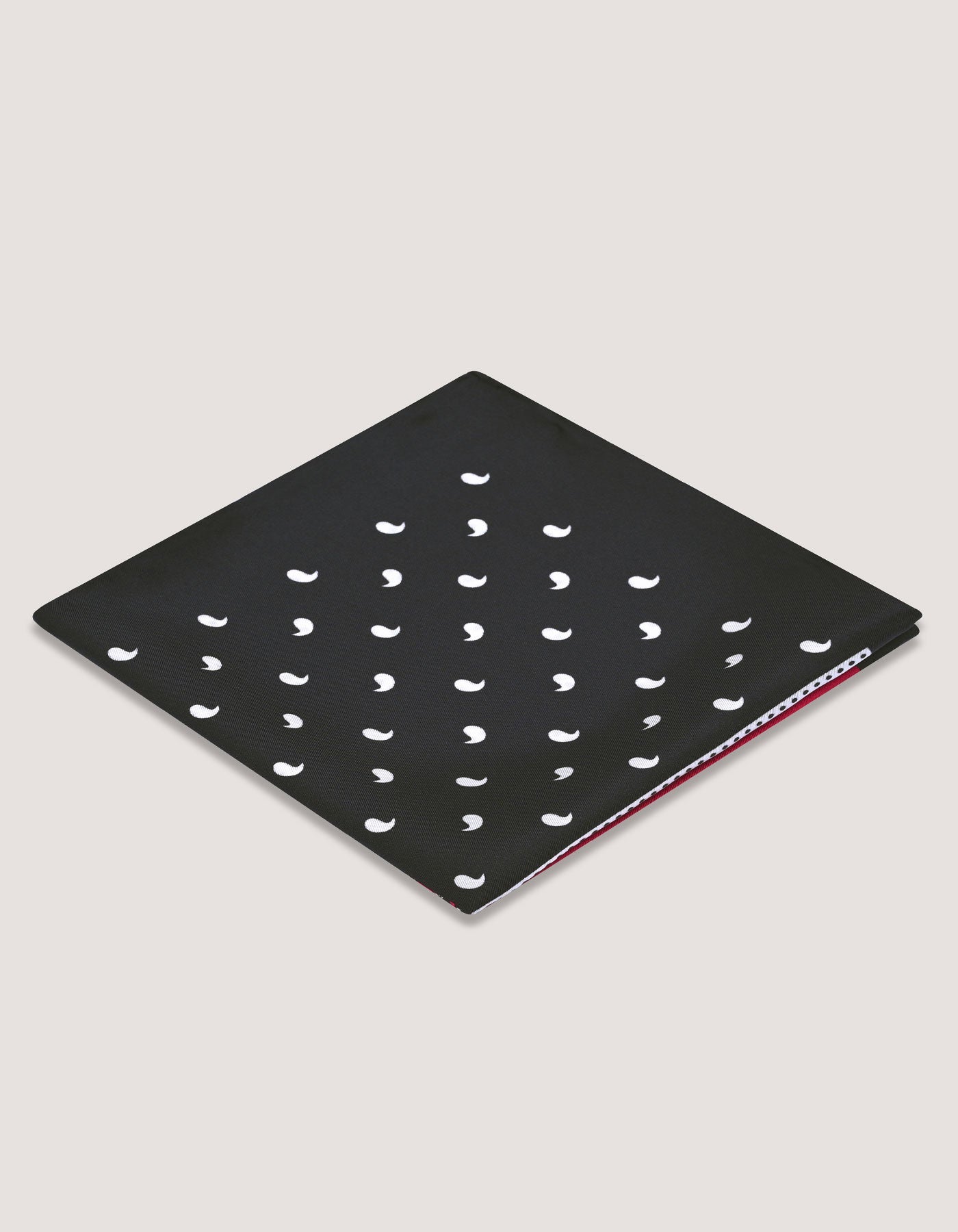 Add a vibrant edge to your look with this four sided pocket square featuring a striking paisley pattern, classic polka dots, mini paisleys, and a plain side. The rich black, red, and white colour palette displays confidence and style, making it a versatile accessory that enhances both formal and casual attire. Perfect for anyone who appreciates unique details and the ability to switch up their look with ease.