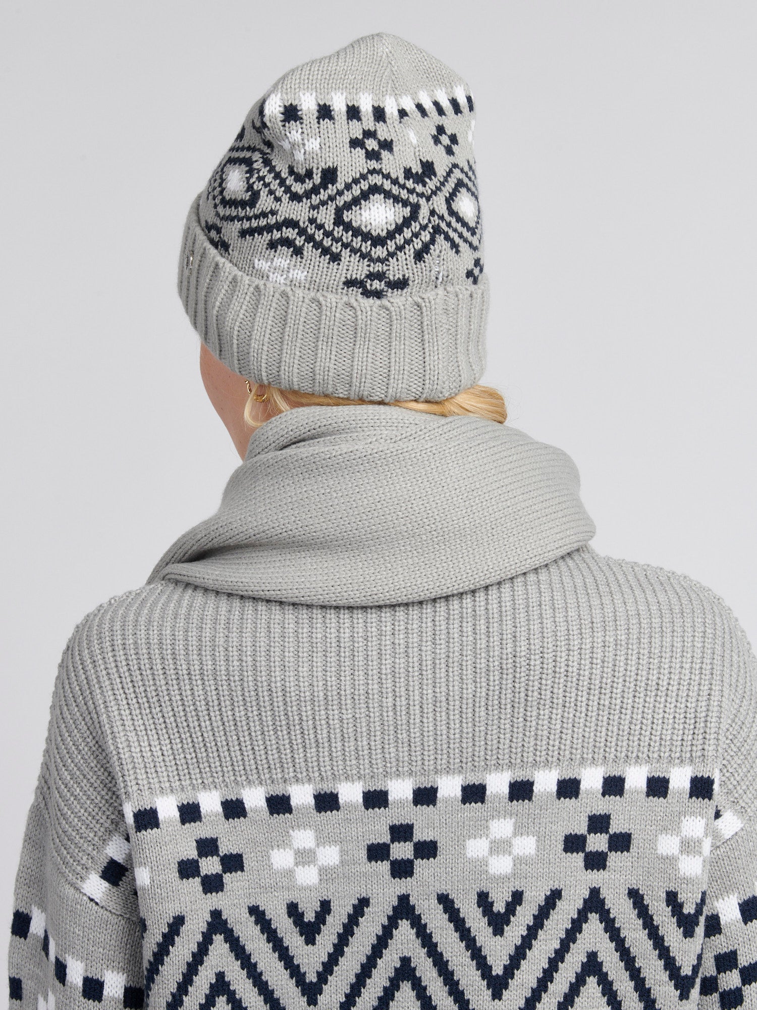 Womens Fair Isle Beanie & Scarf Set in Pearl Grey Marl