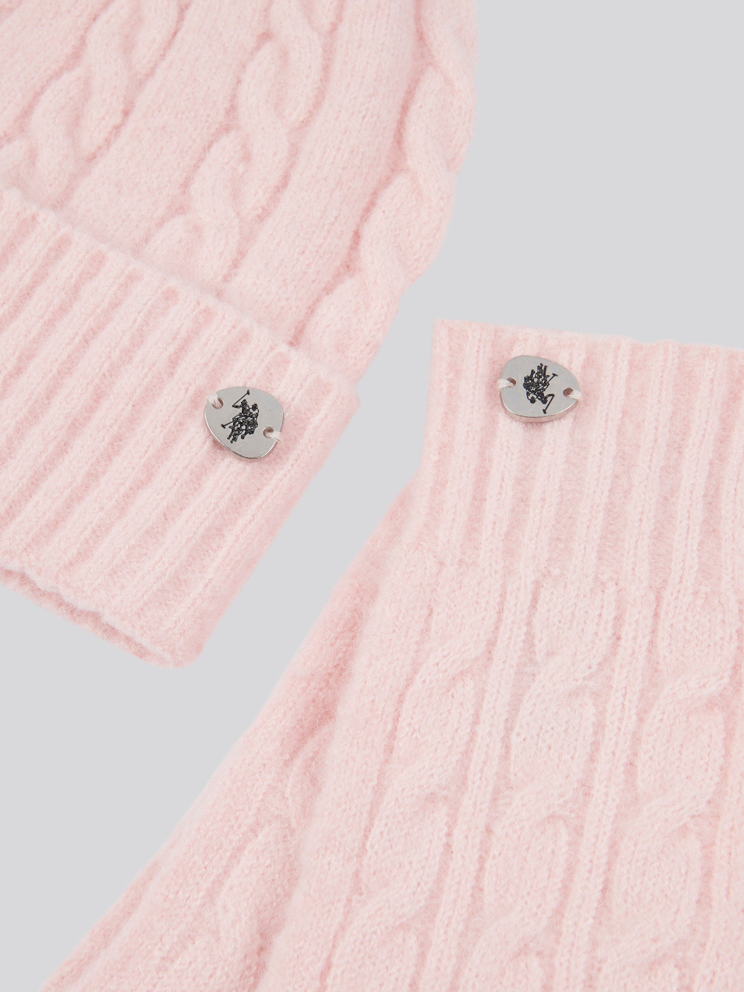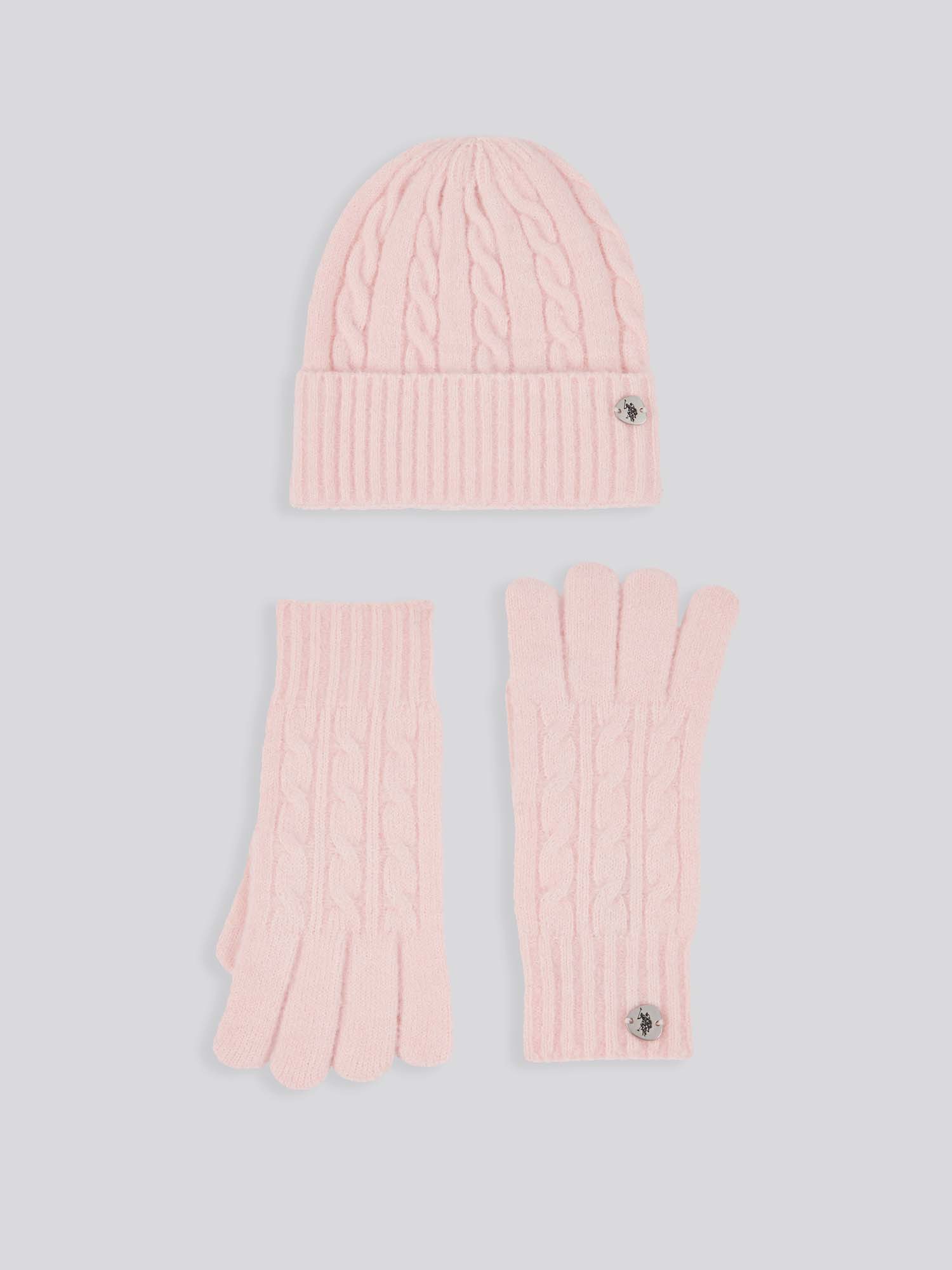 - Signature cable knit design on both beanie and gloves