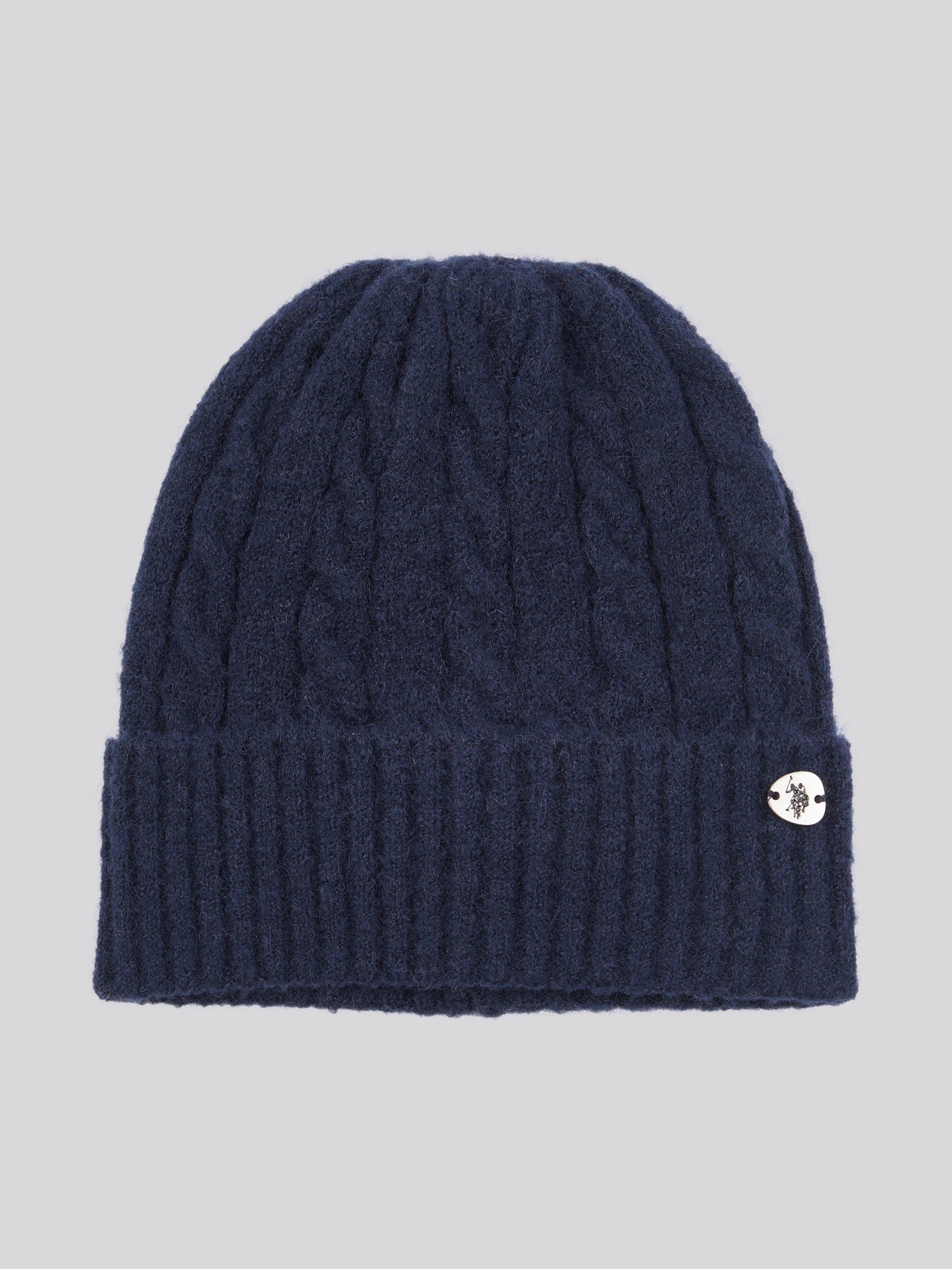 The U.S. Polo Assn. Womens Signature Cable Knit Beanie is a quintessential blend of classic charm and contemporary elegance. Expertly crafted from the finest quality yarns, this beanie offers a luxurious handfeel and exceptional comfort, making it an essential accessory for the stylish, discerning woman.